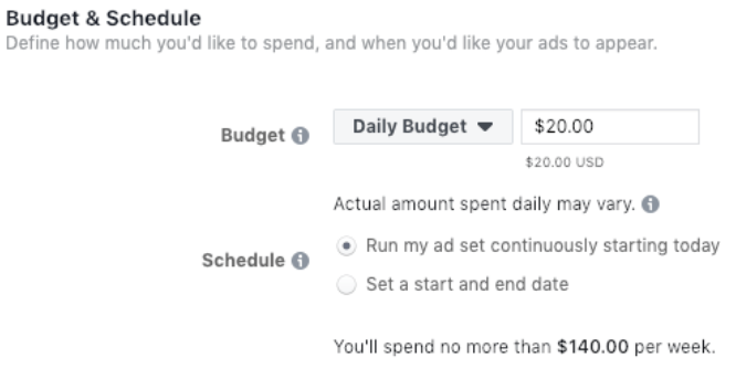 - Визначте, скільки ви готові витратити на рекламу. Можна встановити денний бюджет або бюджет на певний період (наприклад, на тиждень чи місяць).