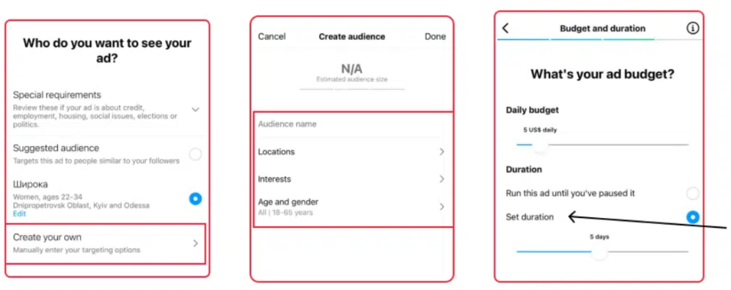 - Визначте, хто саме буде бачити вашу рекламу, використовуючи демографічні параметри, інтереси та поведінкові характеристики.